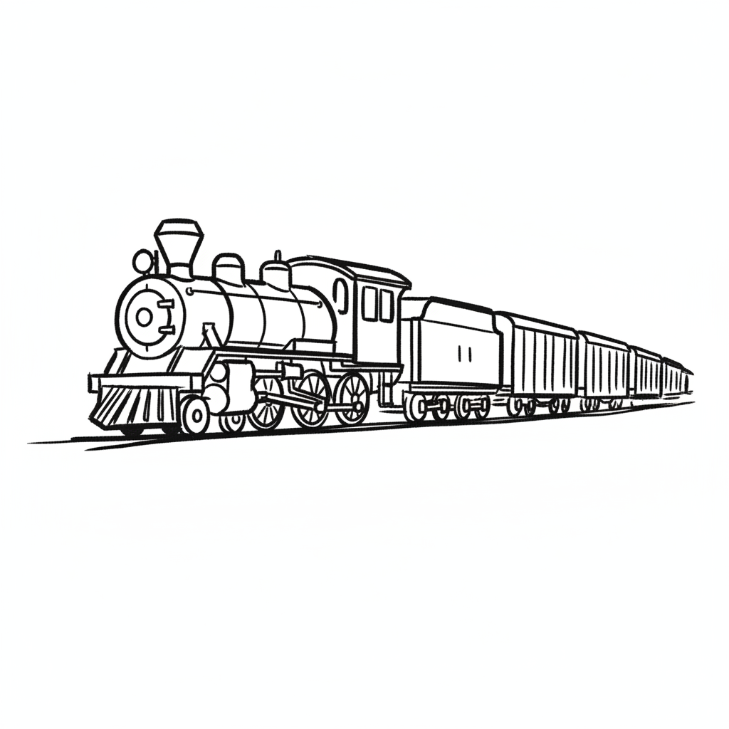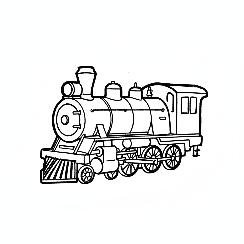 Schwarz-weiße Strichzeichnung einer klassischen Dampflokomotive, ideal zum Ausmalen.