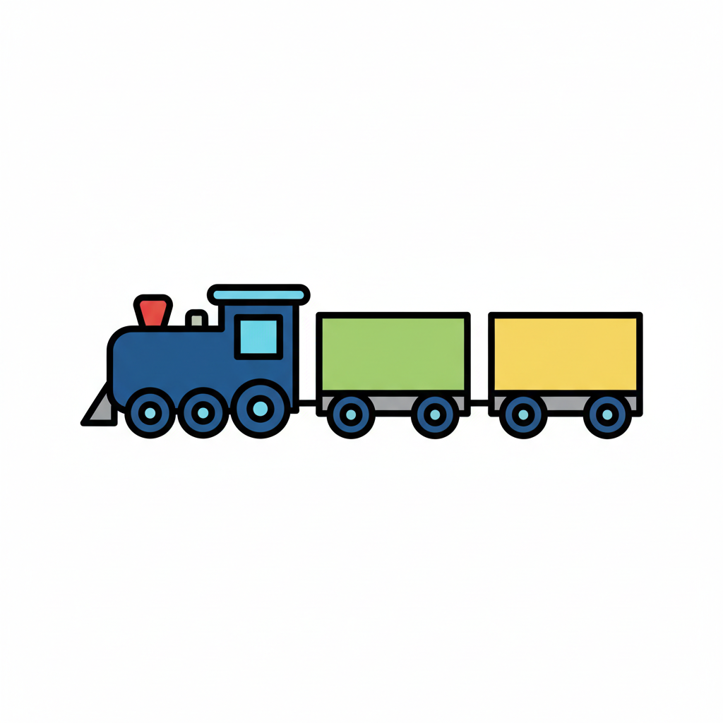 Buntes Cartoon-Bild eines Spielzeugzugs mit blauer Lokomotive und zwei Waggons (grün, gelb).