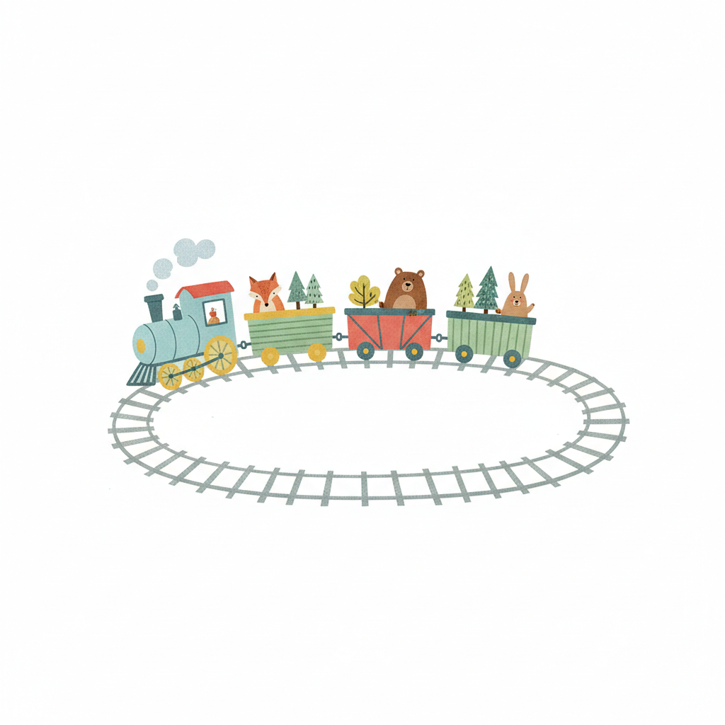 Niedlicher Cartoon-Zug mit Fuchs, Bär und Hase fährt auf ovaler Schiene mit Bäumen.
