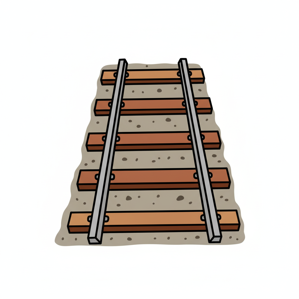 Cartoon-Eisenbahngleis mit grauen Schienen und braunen Holzschwellen auf einem Schotterbett.