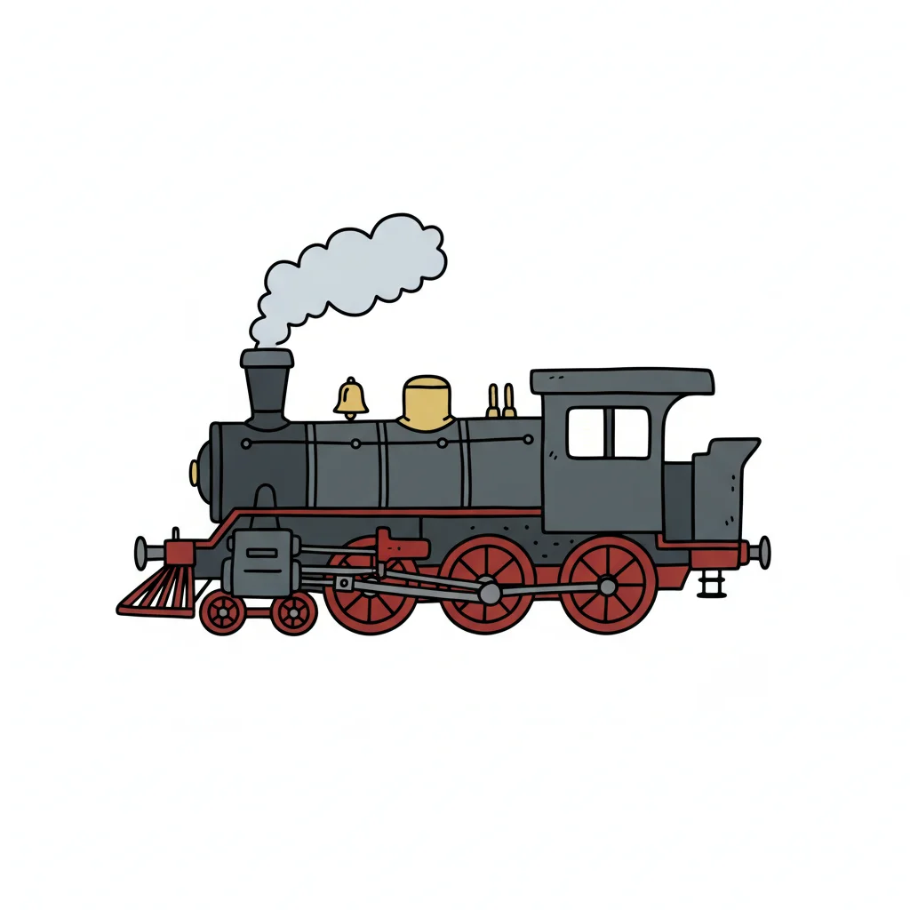 Cartoon-Zeichnung eines Dampfzugs mit roter Lokomotive und bunten Waggons auf Gleisen.