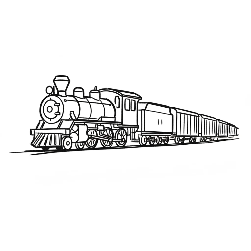 Schwarz-weiße Strichzeichnung eines langen Zuges mit Dampflokomotive und mehreren Güterwagen.