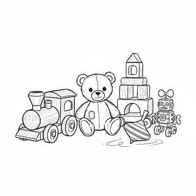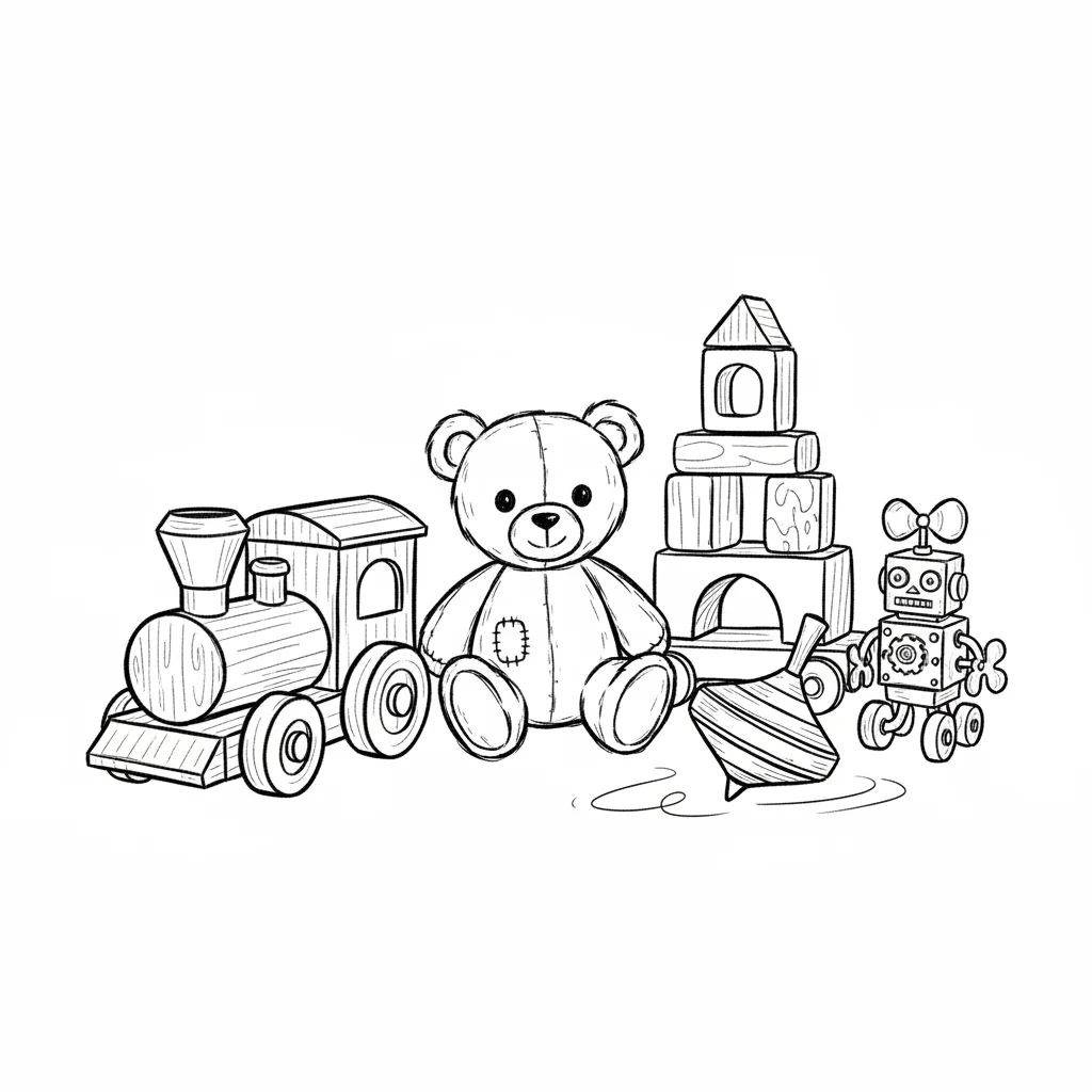 Schwarz-weiß-Zeichnung von Kinderspielzeug: Teddybär, Holzeisenbahn, Bauklötze, Kreisel, Roboter.