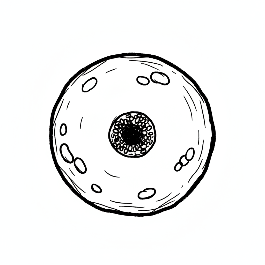 Schwarz-weiße Zeichnung einer runden Form mit zentraler Textur und kleineren Kreisen.