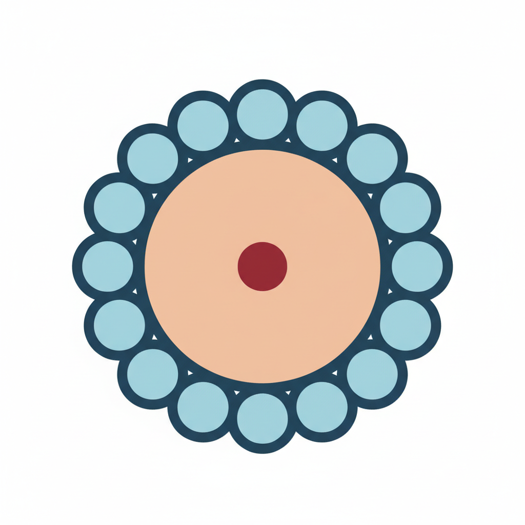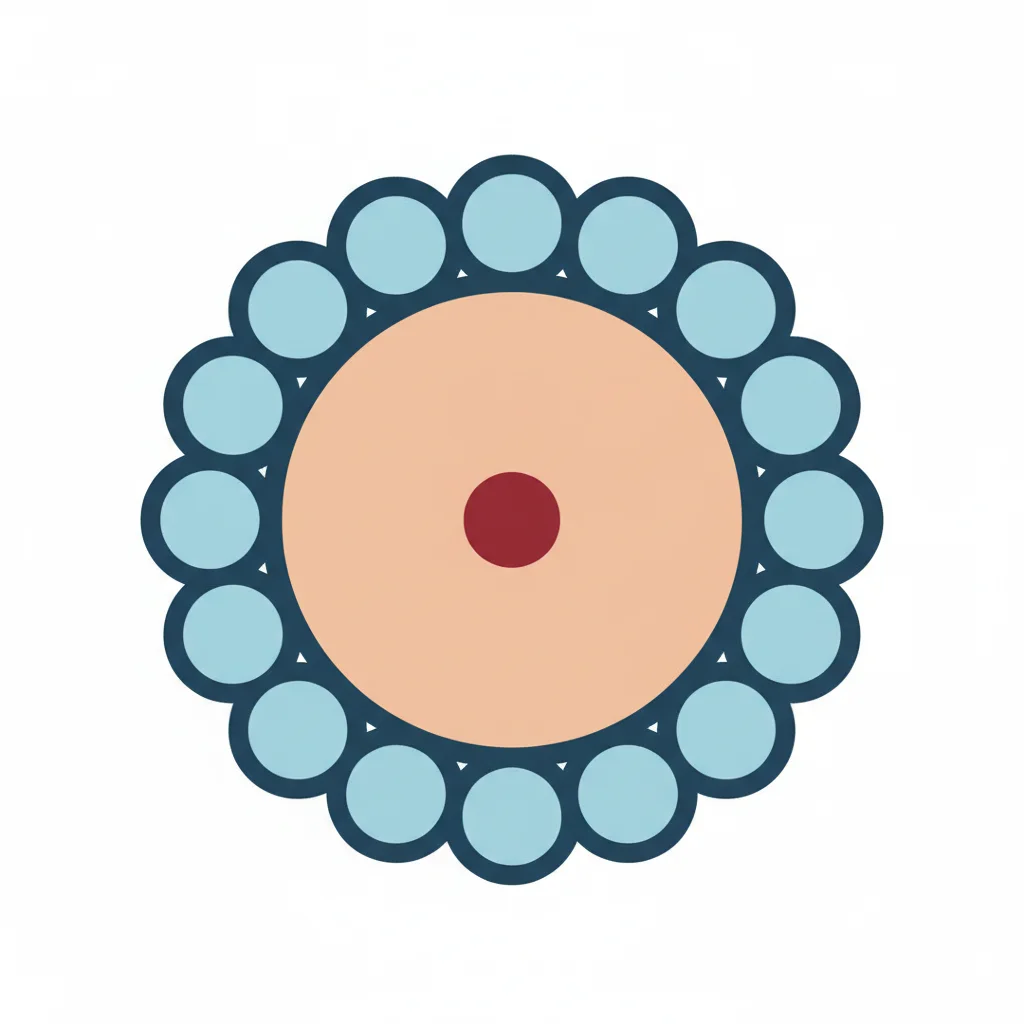 Stilisierte runde Form mit rotem Zentrum, umgeben von blauen Kreisen auf weißem Grund.