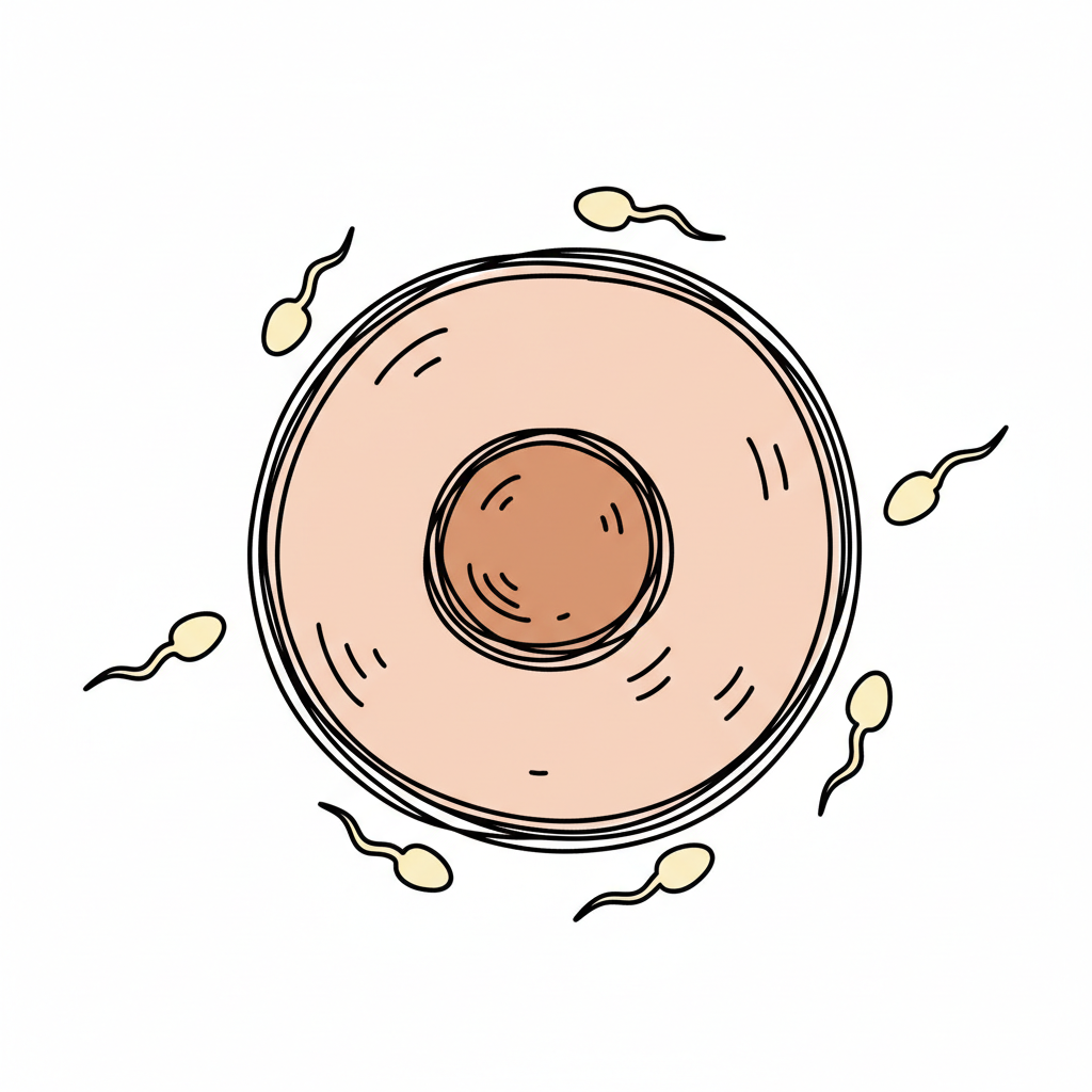 Handgezeichnete Illustration einer Eizelle, umgeben von Spermien, die die Befruchtung darstellen.