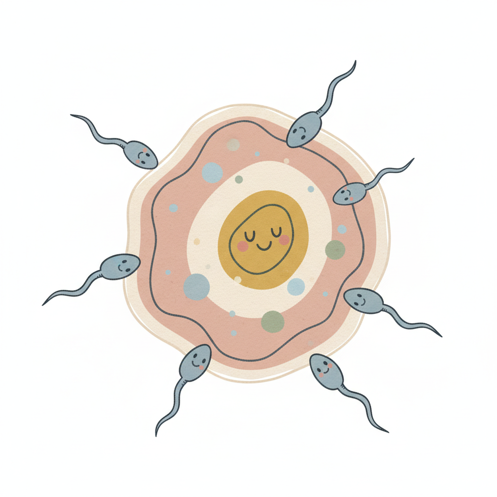 Cartoon-Darstellung einer lächelnden Eizelle, umgeben von lächelnden Spermien, die Befruchtung symbolisieren.