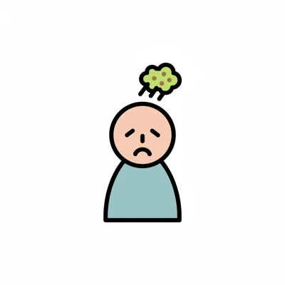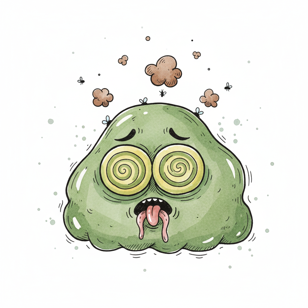 Ein cartoonhaftes, grünes Ungeziefer mit wirbelnden Augen und schmelzendem Gesicht.