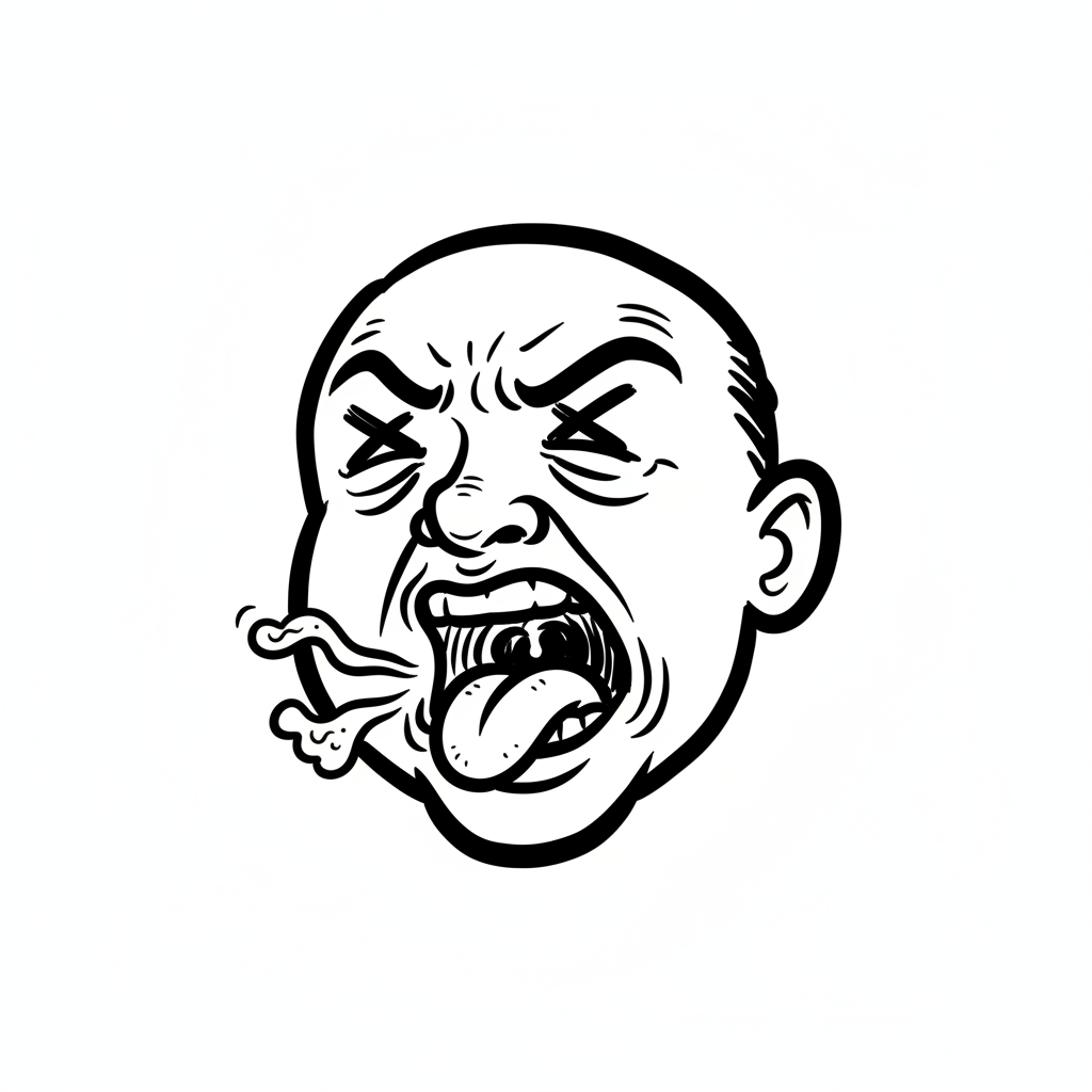 Ein wütender Mann mit herausgestreckter Zunge und verzerrtem Gesicht.