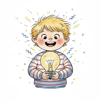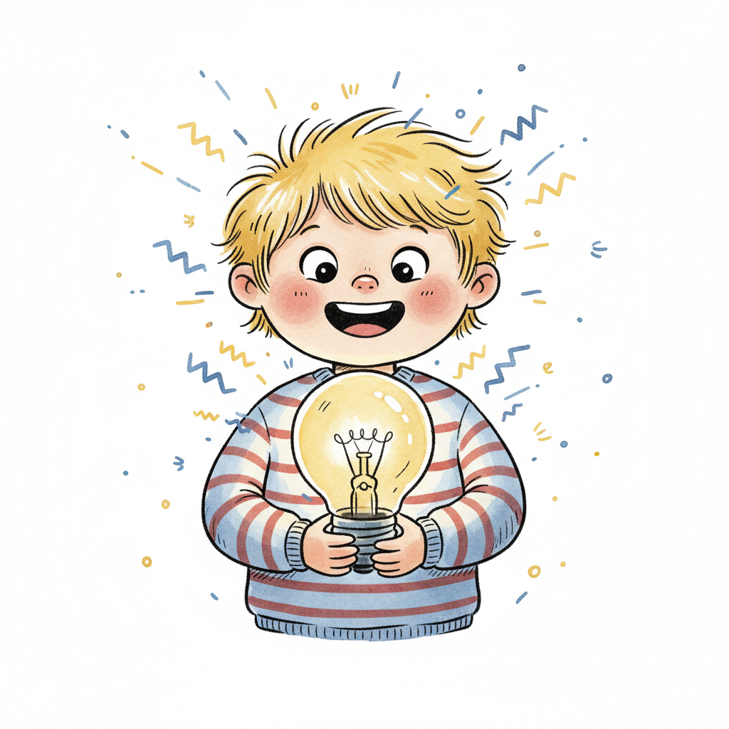 Ein lächelnder Junge hält eine leuchtende Glühbirne, umgeben von Funken, die eine Idee symbolisieren.