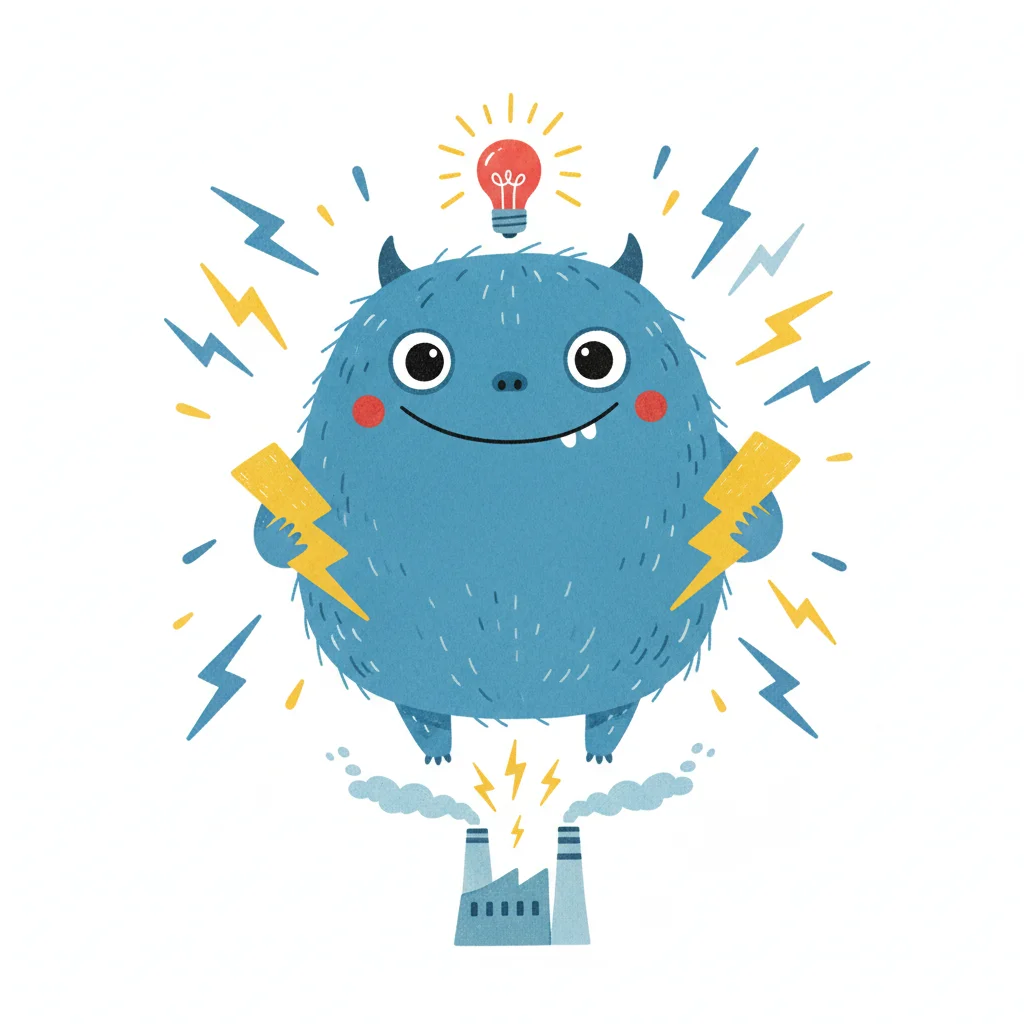 Niedliches blaues Monster mit Glühbirne und Blitzen, das Energie aus einer Fabrik zieht.