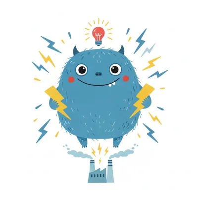 Ein fröhlicher Cartoon-Junge hält Blitze, umgeben von elektrischen Funken und einem Stecker.