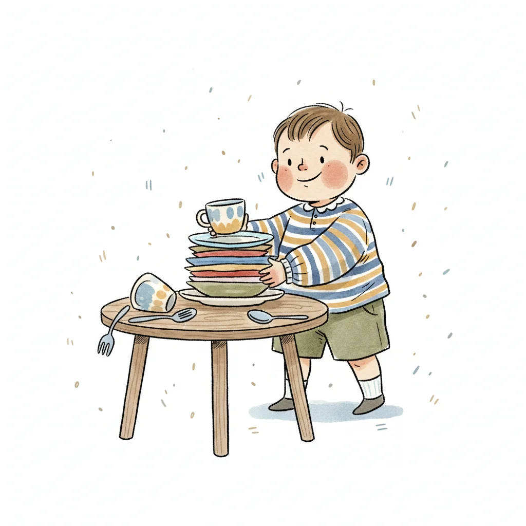 Ein Junge stapelt Teller und Tassen auf einem kleinen Tisch.