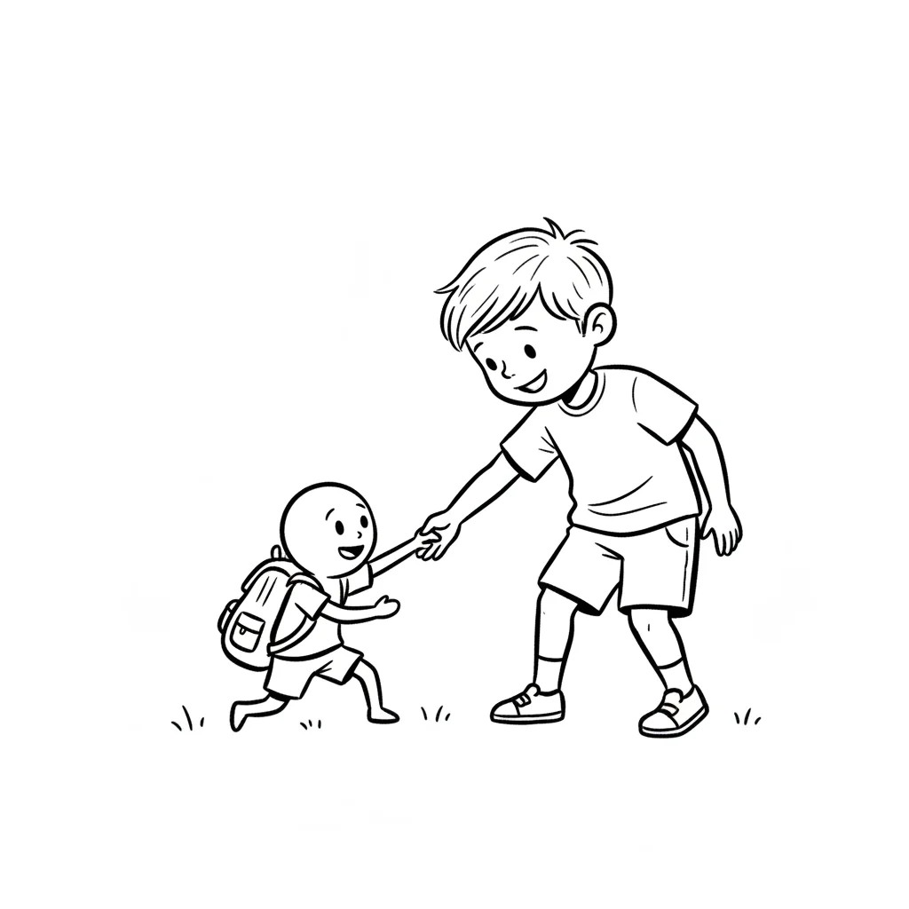 Minimalistische, handgzeichnete Illustration mit deutlich handgezeichneter Wirkung. Handgezeichnete Schwarze Konturen ungleichmäßig und unregelmäßig von Hand gezeichnet. Figuren werden mit stark vereinfachten Körperformen dargestellt. Arme und Beine sind nur als einfache Linien oder Strichformen angedeutet. Flächige Farben ohne Verläufe oder Texturen, ruhige harmonische Farbpalette und reduzierte Details sorgen für eine klare, kindgerechte Darstellung. Saubere, übersichtliche Komposition mit rein weißem Hintergrund.