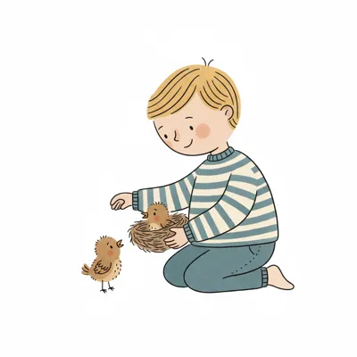 Ein Junge kümmert sich um Vögel in einem Nest.