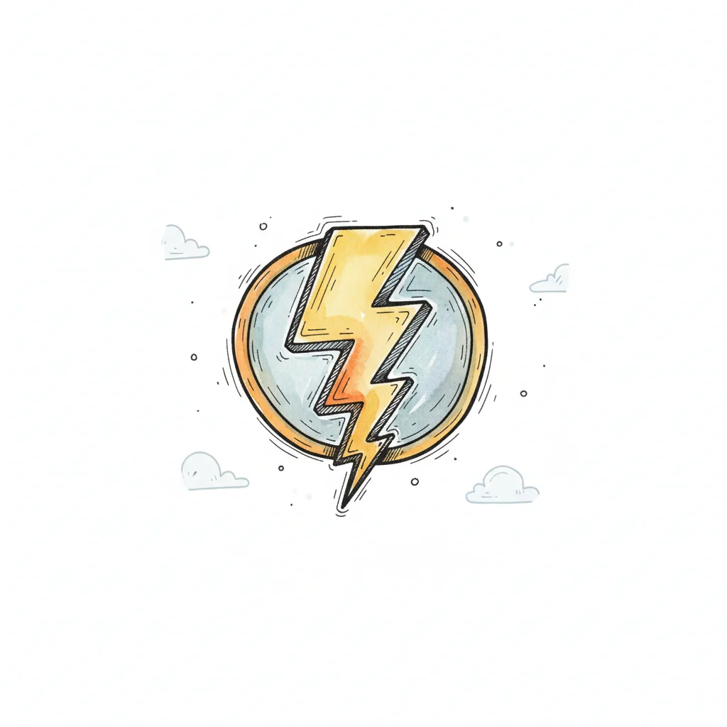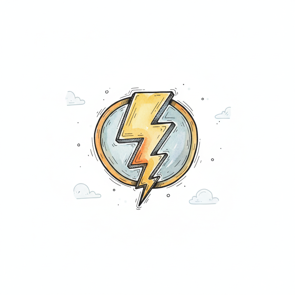 Handgezeichnetes Blitz-Emblem in einem Kreis mit Wolken im Hintergrund.