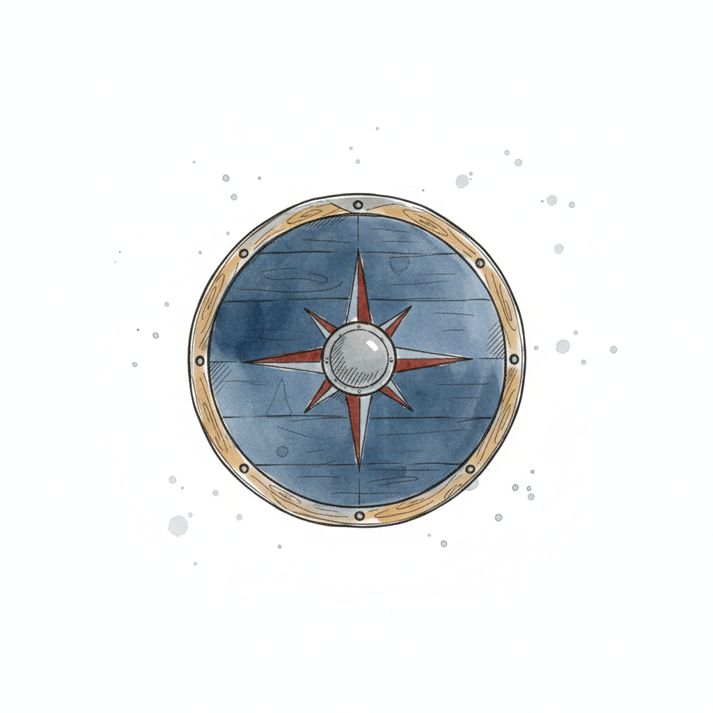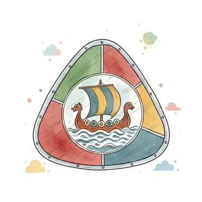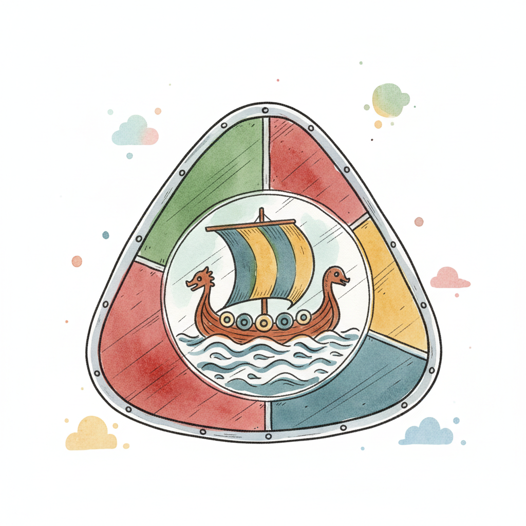 Dreieckiger Schild mit Wikingerschiff-Emblem in Aquarell-Optik.
