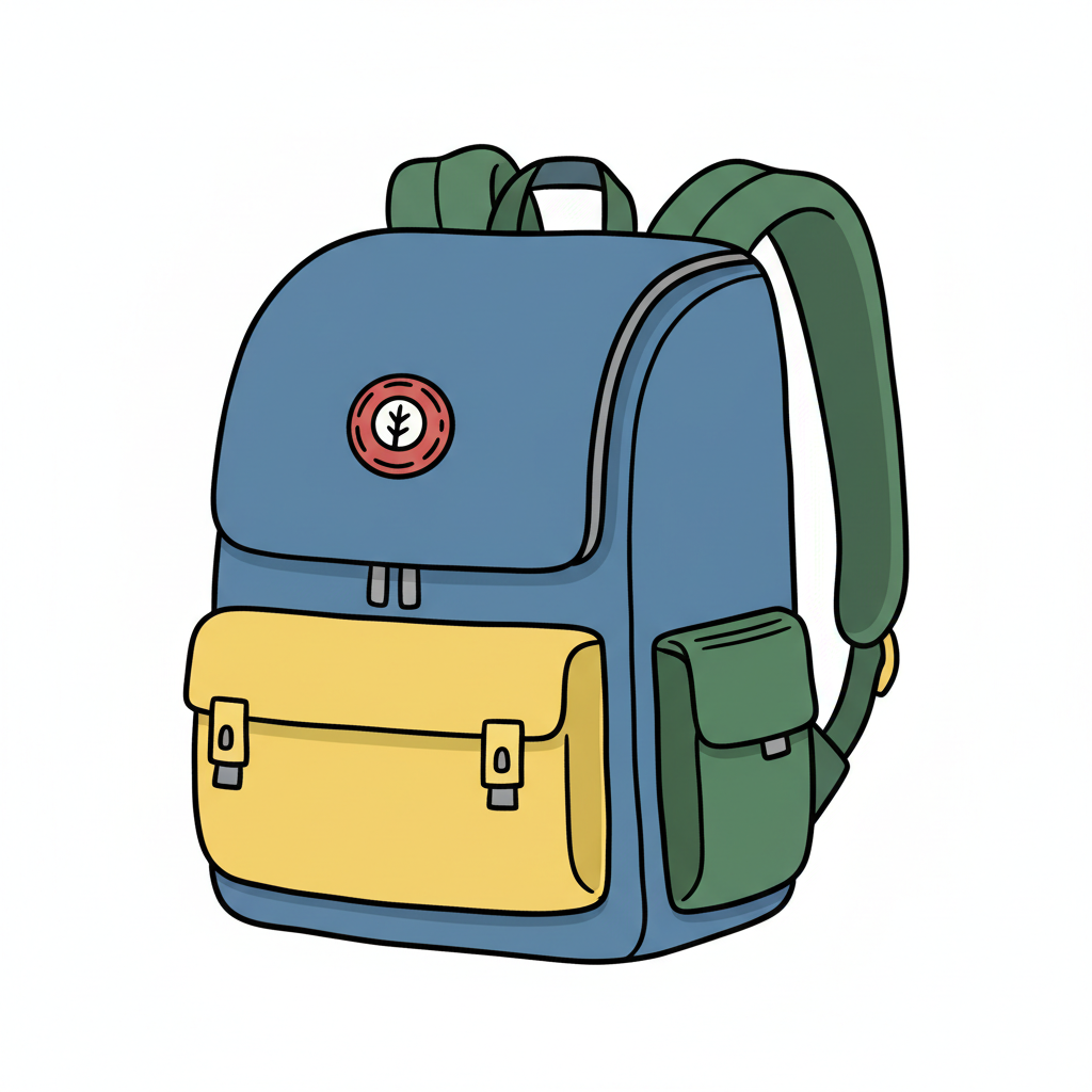 Illustrierter Rucksack in Blau, Gelb und Grün mit Baum-Emblem, ideal für Schule oder Freizeit.