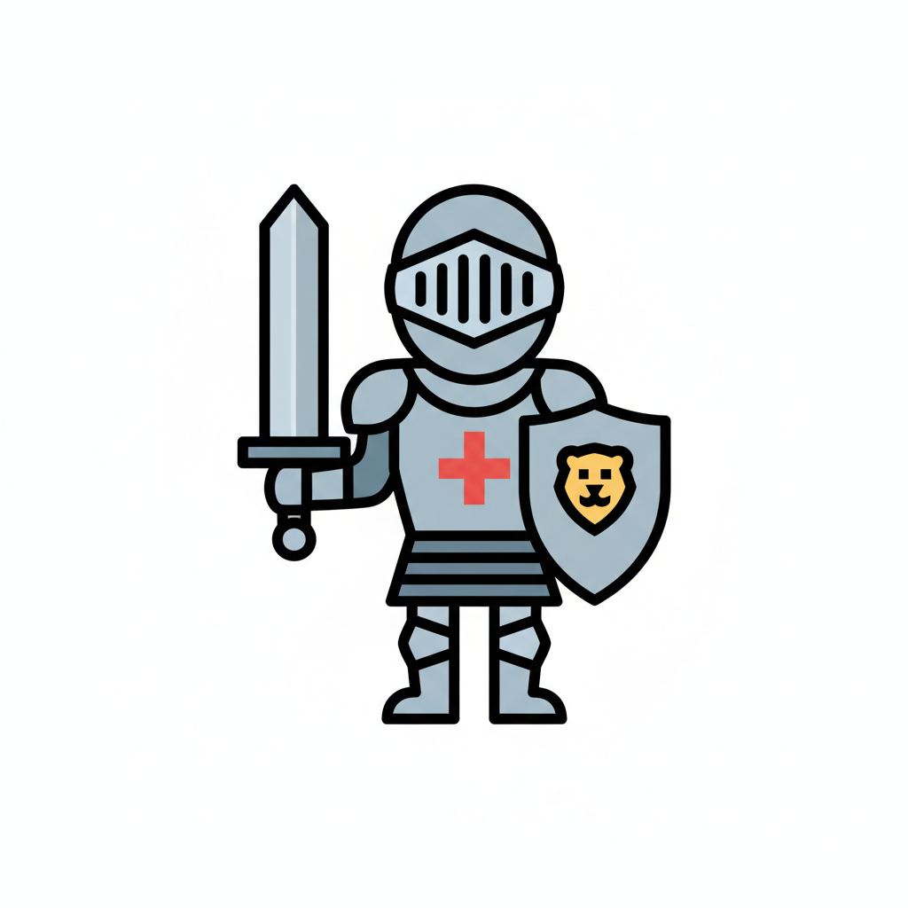Illustration eines Ritters in Rüstung mit Schwert und Schild mit Löwenemblem und rotem Kreuz.