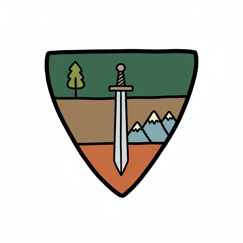 Emblem mit Schwert, Baum und Bergen in einfachem, gezeichnetem Stil.