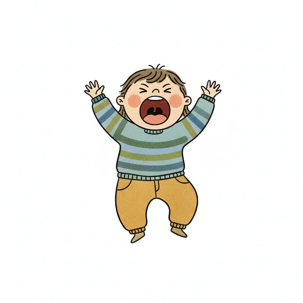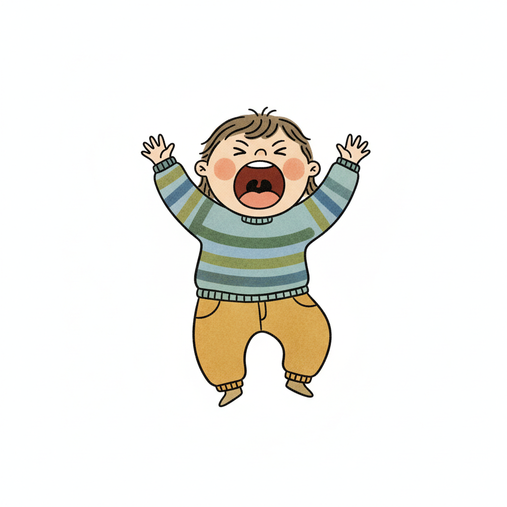 Ein weinendes Kind mit ausgebreiteten Armen und wütendem Gesichtsausdruck.