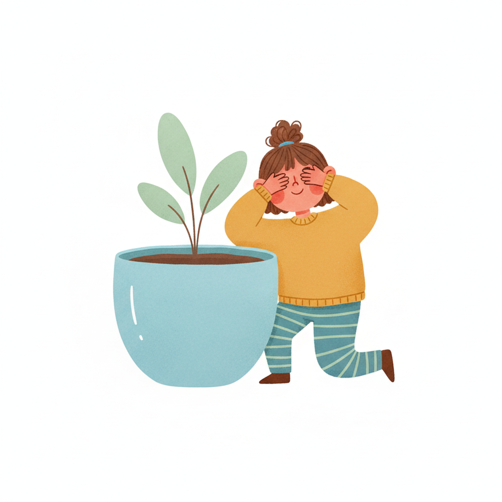 Ein Kind kniet vor einem Pflanztopf und hält sich die Ohren zu.