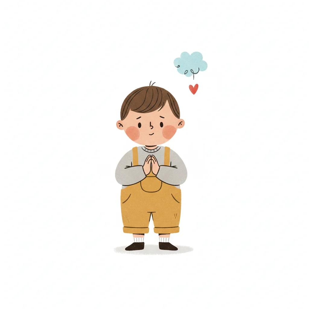 Ein Junge mit gefalteten Händen, der an einen Wolke mit Herz denkt.