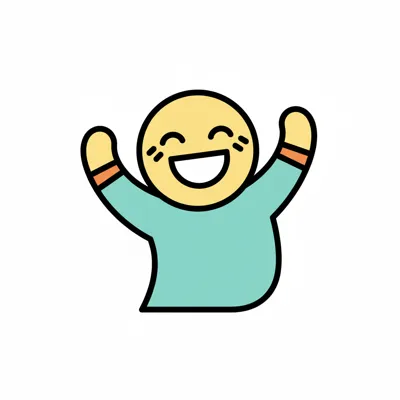 Ein fröhlicher, strahlender Charakter mit erhobenen Armen.