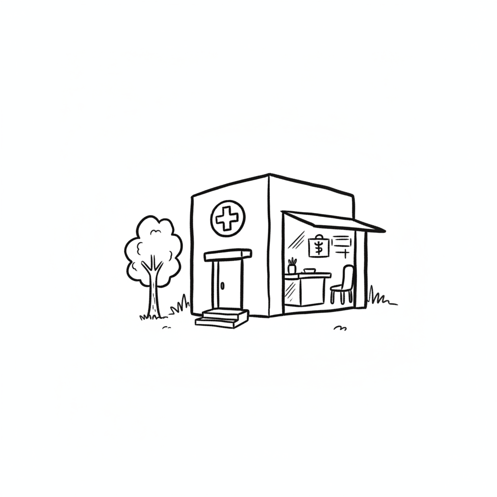 Schwarz-weiße Doodle-Zeichnung einer kleinen Klinik oder Arztpraxis mit Baum und Empfangsbereich.