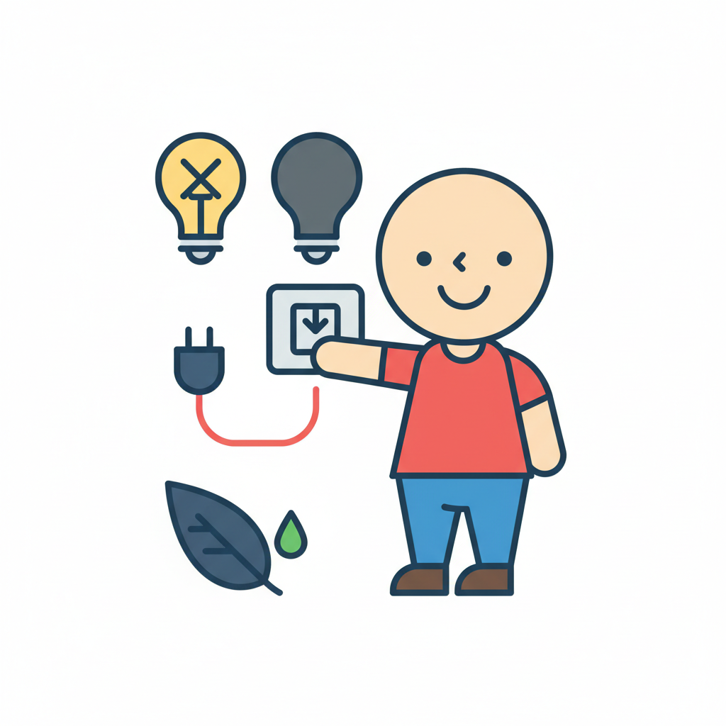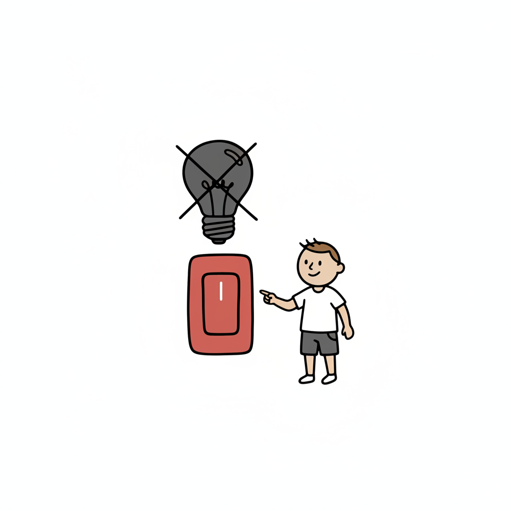 Ein Cartoon-Kind zeigt auf einen Schalter neben einer durchgestrichenen Glühbirne, die aus ist.