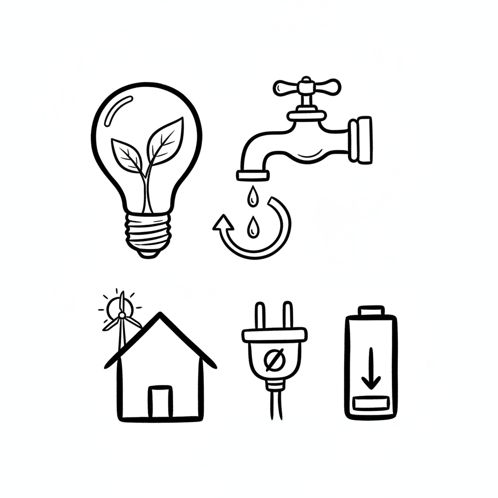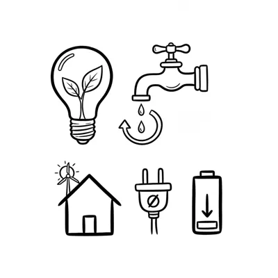 Icons für Nachhaltigkeit: grüne Energie, Wassersparen, erneuerbare Energien, Energieeffizienz.