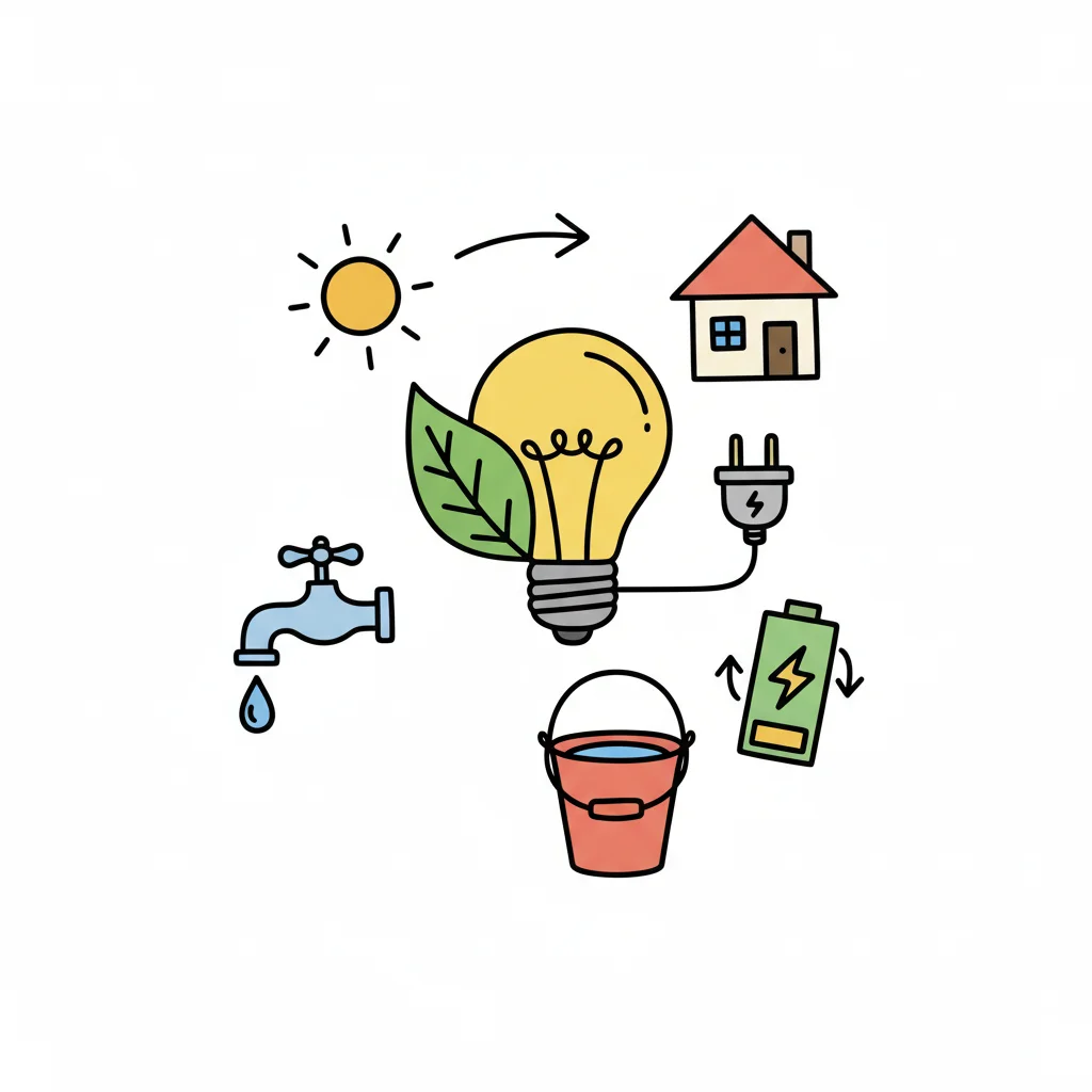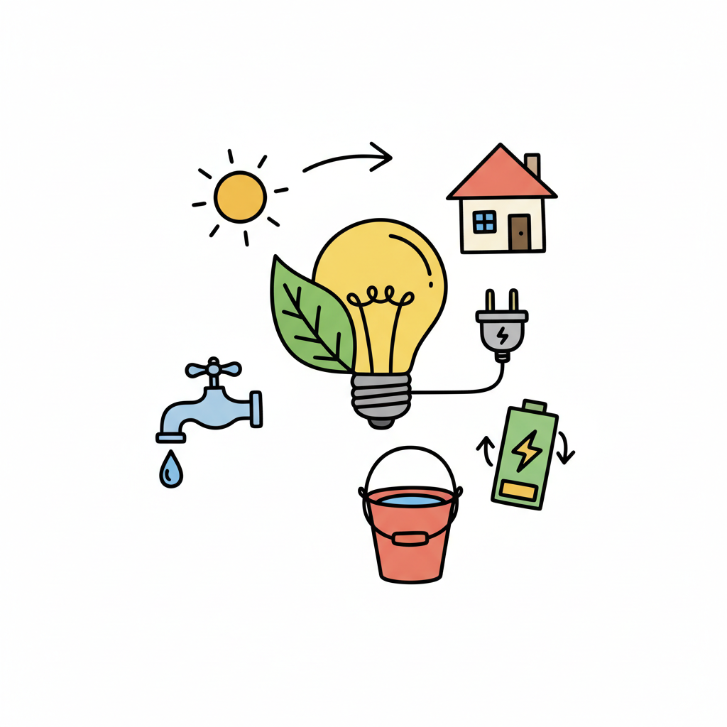 Buntes Doodle zu Nachhaltigkeit: Sonne, Glühbirne, Haus, Wasserhahn, Batterie und Eimer.