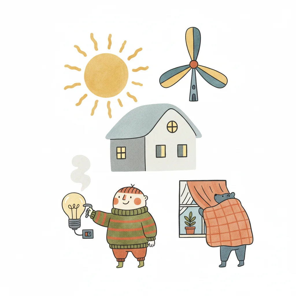 Kind, Bär und Haus nutzen erneuerbare Energien (Sonne, Wind) und sparen Energie.