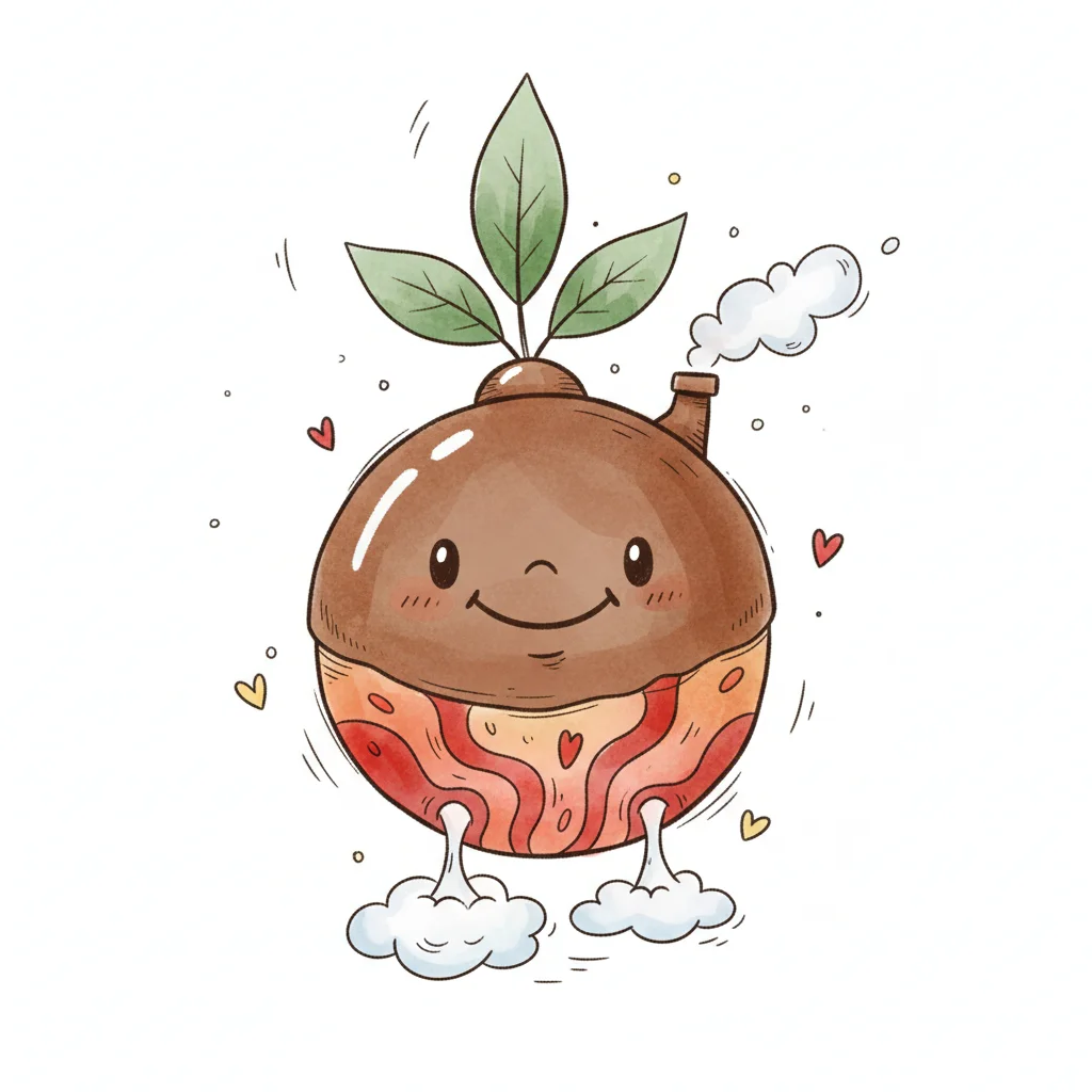 Für ältere Kinder illustrierter Gegenstand als einzelner, zentrierter Gegenstand vor weißem Hintergrund, im frech-nordischen Aquarell-Skizzenstil. Klare, leicht wackelige Tuschekonturen, sichtbare Pinsel- und Strichtextur, dezente Schraffuren, weiche handgemalte Farbflächen in gedeckten Farben. Runde, einfache Formen. Keine harten Schatten, sondern sanfte, transparente Aquarellschichten. Leicht raue, handgezeichnete Linien statt glatter Vektorkanten. Subtile, vereinzelte Kritzelpunkte oder kleine Details im Hintergrund, aber keine echte Szene. Gegenstand steht oder schwebt mittig. Insgesamt charmant, humorvoll, warm und handgemacht wirkend, wie eine moderne Illustration auf weißem Hintergrund. Gegenstände sollen keine Gesichter haben.
