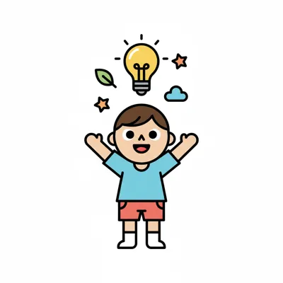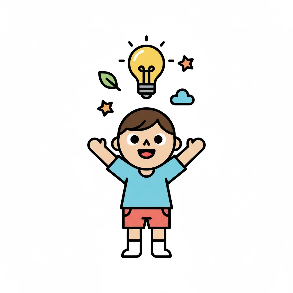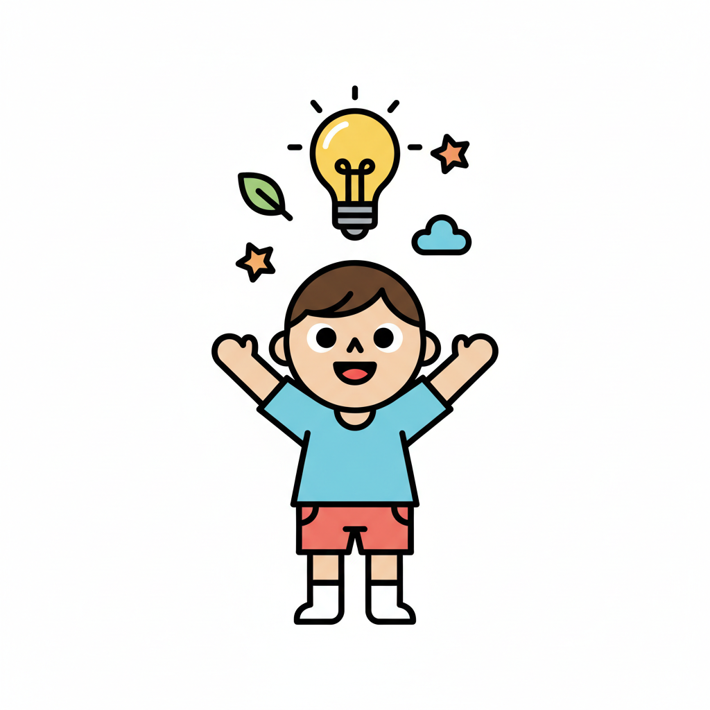 Cartoon-Junge mit leuchtender Glühbirne, Blatt, Sternen und Wolke über dem Kopf, symbolisiert Ideen.