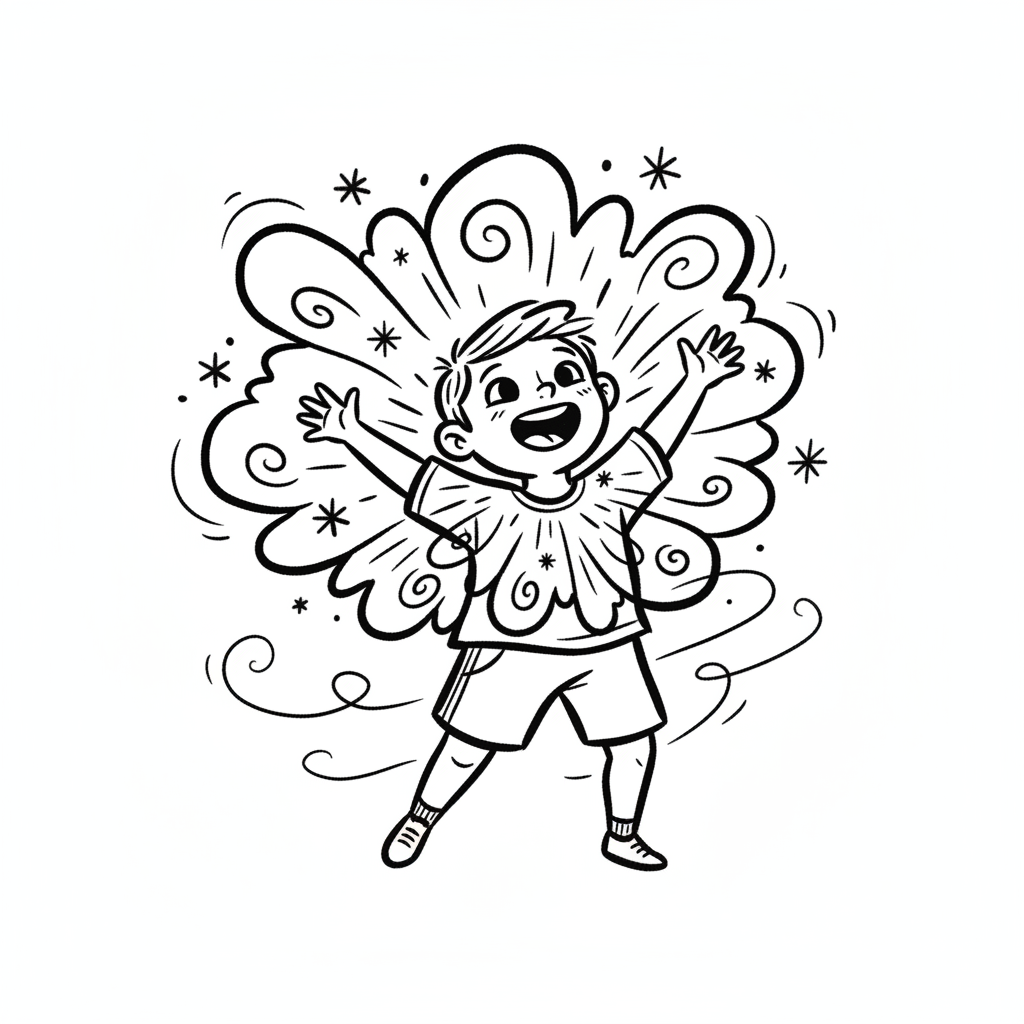 Ein glücklicher Junge mit erhobenen Armen, umgeben von magischen Wirbeln und Sternen.