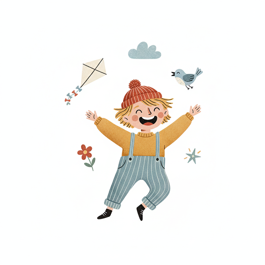 Fröhliches Kind springt mit offenen Armen, umgeben von Drachen, Vogel und Blume.