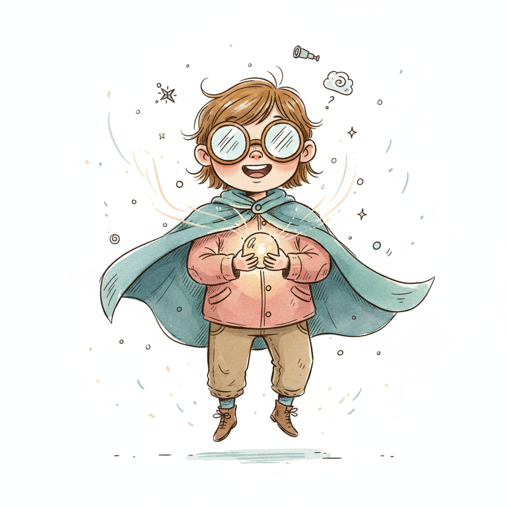 Ein fröhliches Kind mit Brille und Umhang schwebt, hält eine leuchtende Kugel, umgeben von Fantasie.