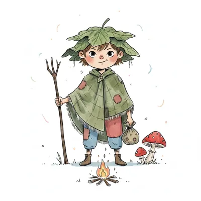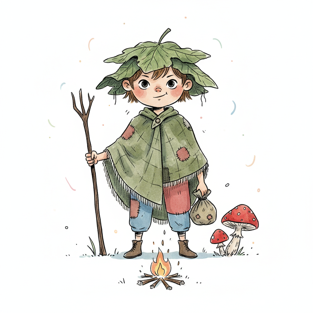 Niedliches Kind mit Blätterhut und Poncho am Lagerfeuer, umgeben von Pilzen.