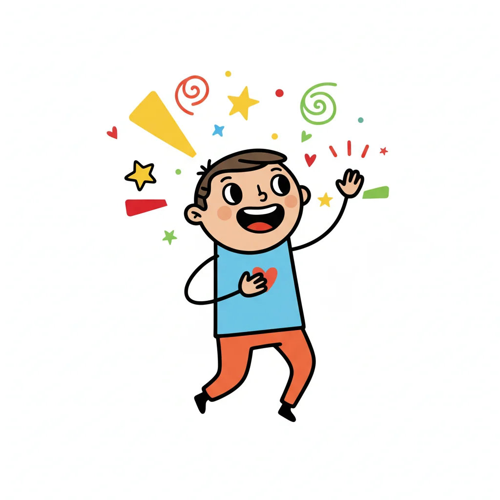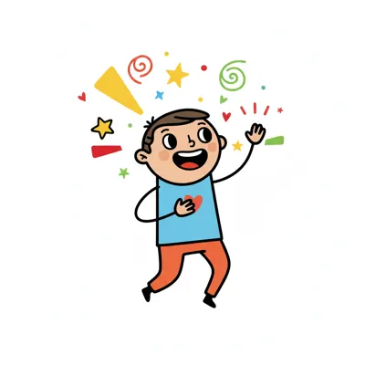 Fröhlicher Cartoon-Junge winkt, umgeben von bunten Sternen und Konfetti.