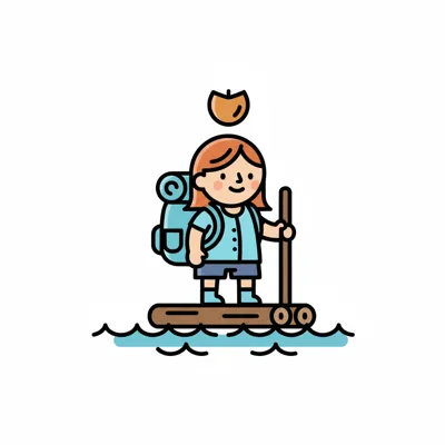 Fröhliche Zeichentrickfigur mit Rucksack paddelt auf einem Holzfloß im Wasser.