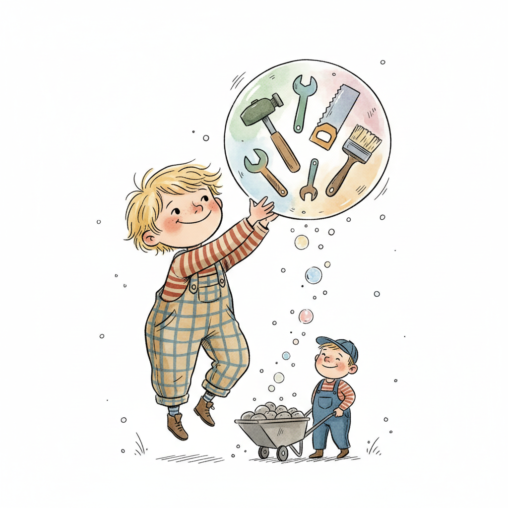Ein Junge schwebt und greift nach einer Werkzeugblase, während ein kleinerer Junge eine Schubkarre schiebt.