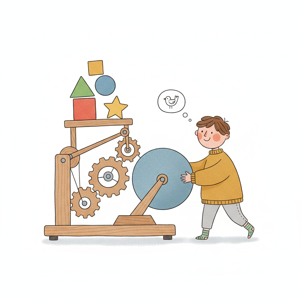 Ein Junge bedient eine Holzmaschine mit Zahnrädern und bunten Formen, während er an einen Vogel denkt.