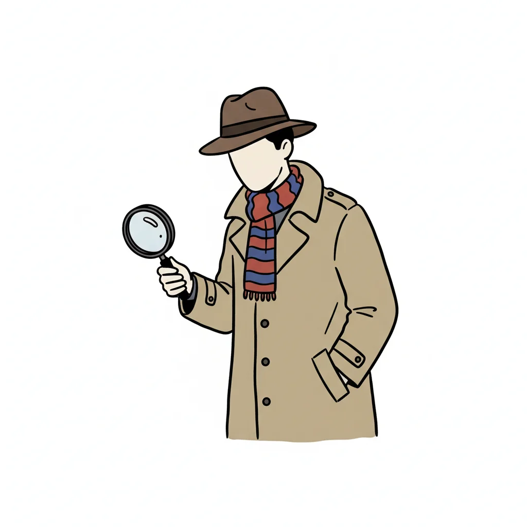 Illustration eines Detektivs mit Hut, Trenchcoat und Lupe, der etwas untersucht.