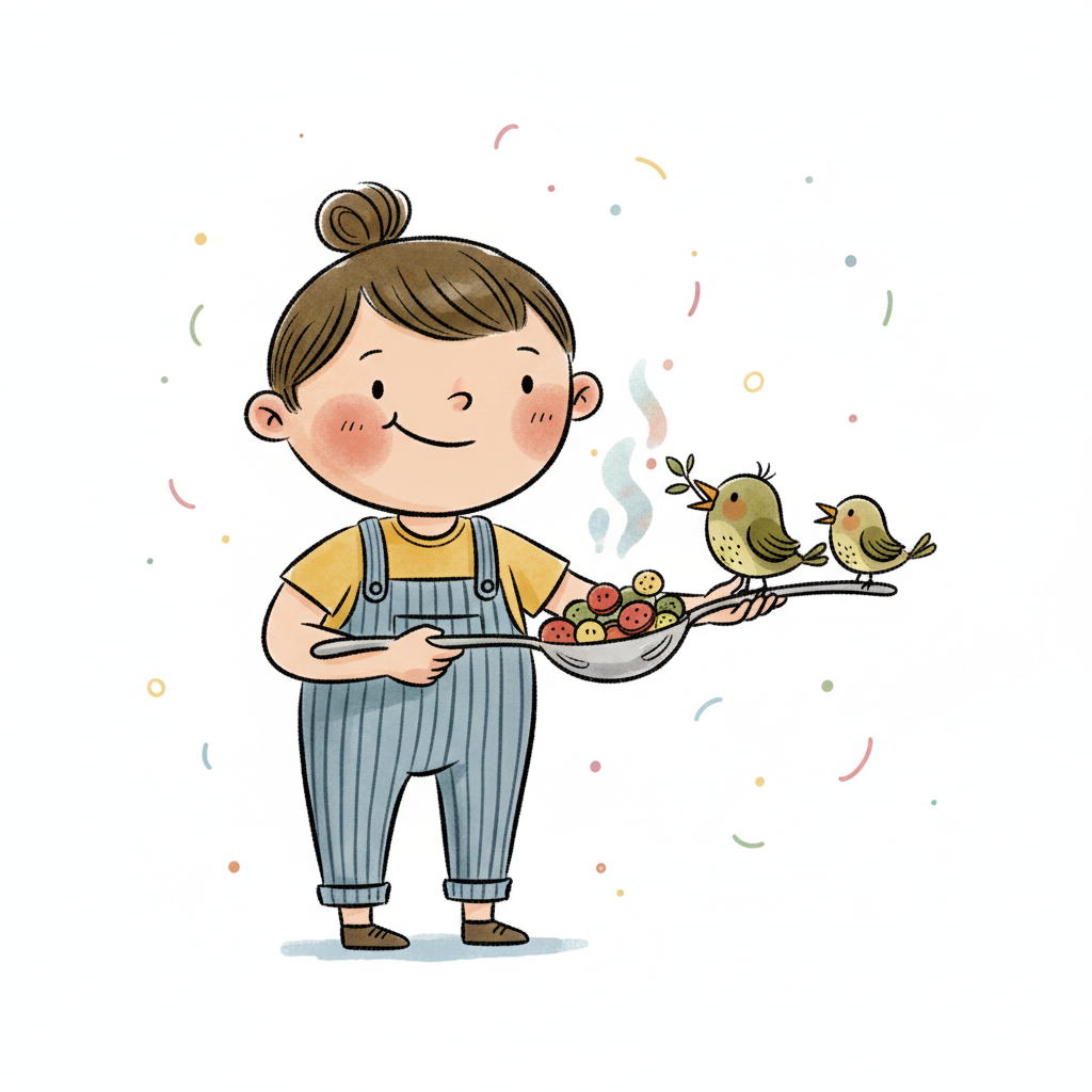 Lächelndes Kind in Latzhose hält Löffel mit Essen, auf dem zwei Vögel sitzen.