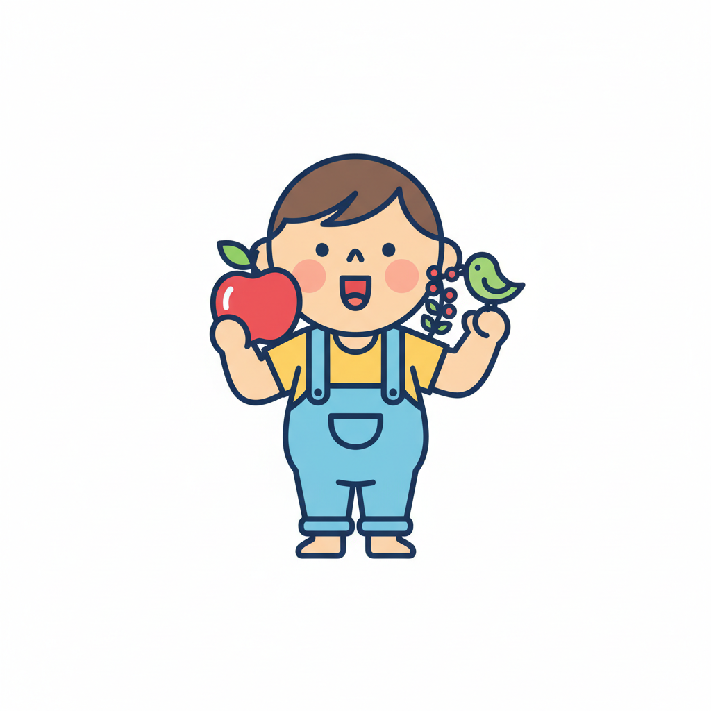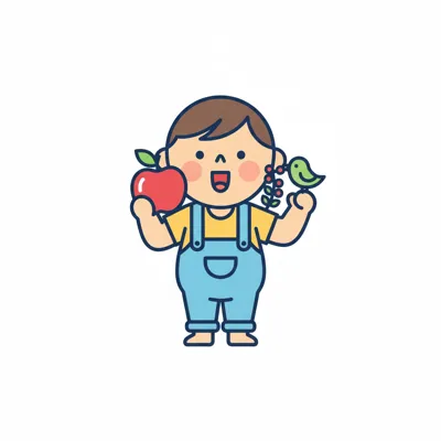Fröhliches Cartoon-Kind in Latzhose hält Apfel, Beeren und einen Vogel.