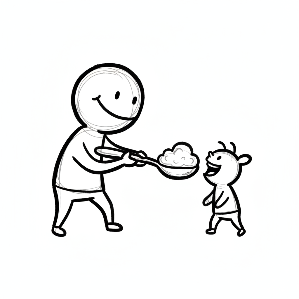 Ein lächelnder Erwachsener füttert ein kleines Kind mit einem Löffel Brei. Eine Szene der Fürsorge.