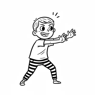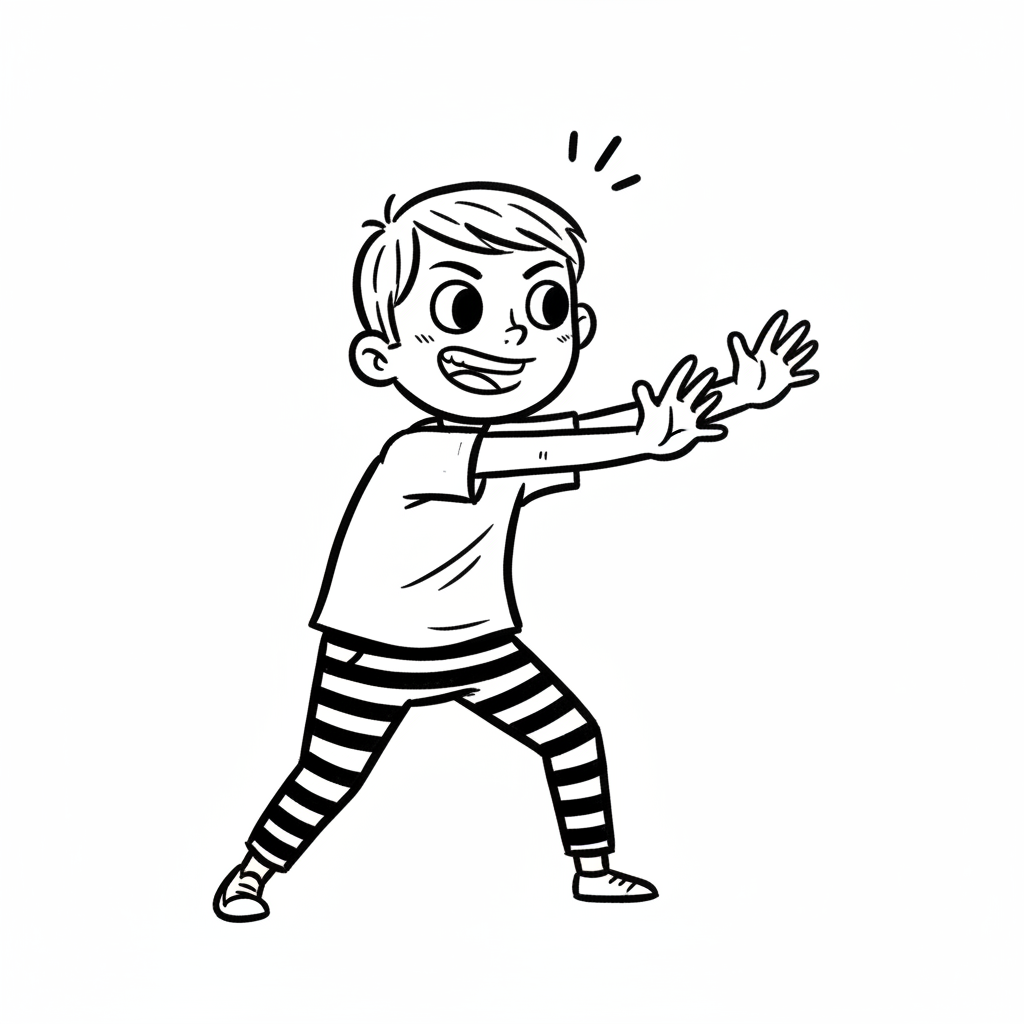 Ein lächelnder Cartoon-Junge mit ausgestreckten Armen und gestreiften Hosen, in spielerischer Pose.