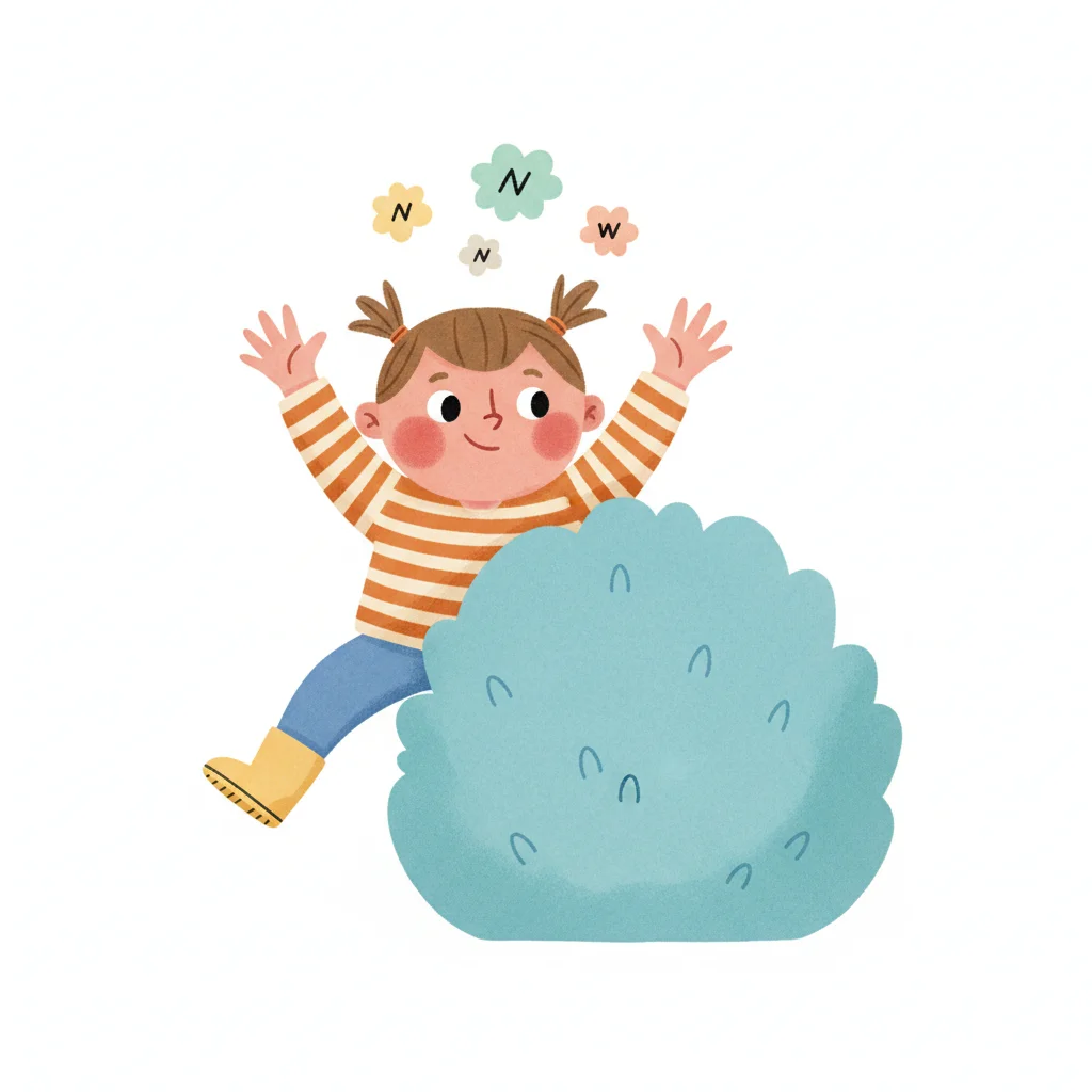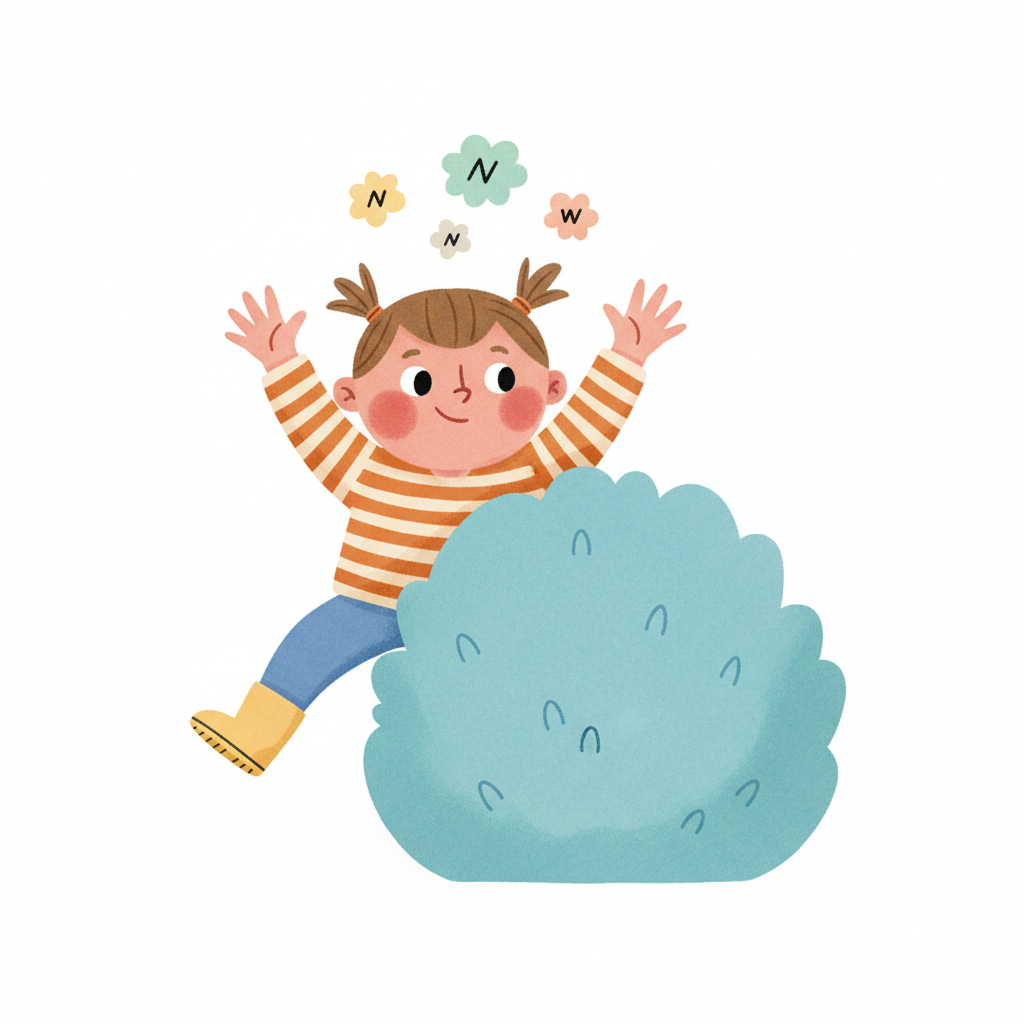 Fröhliches Mädchen springt hinter Busch, Buchstaben N und W schweben über ihr.