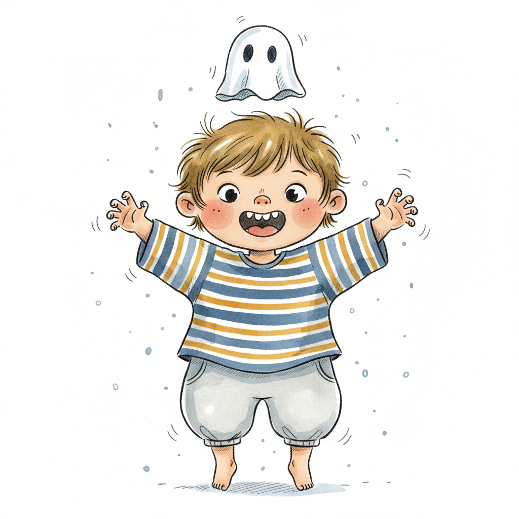 Ein Junge springt erschrocken vor einem kleinen Geist.
